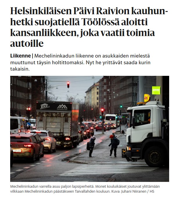 Aloin etsiä tietoa Helsingin vaarallisista risteyksistä, ja törmäsin Hesarin kollegani, kaupunkitoimittaja Marja Salomaan uutiseen 25.11.2024: ”Helsinkiläisen Päivi Raivion kauhunhetki suojatiellä Töölössä aloitti kansanliikkeen, joka vaatii toimia autoille”